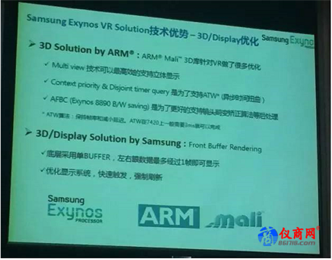 最后總結(jié)一下,三星提供的是針對(duì)VR產(chǎn)品的整體解決方案,最大好處是能縮短VR產(chǎn)品從啟動(dòng)到量產(chǎn)的時(shí)間,產(chǎn)品開(kāi)發(fā)門(mén)檻低;技術(shù)方面,三星擁有頂尖的硬件/軟件技術(shù)水平,例如已經(jīng)量產(chǎn)的Exynos 7、最新的Exynos 8;三星和ARM都是國(guó)際性的大公司,在VR項(xiàng)目上也開(kāi)展了非常緊密的合作,開(kāi)放、合作的實(shí)驗(yàn)室針對(duì)中國(guó)客戶可以提供很好的支持。