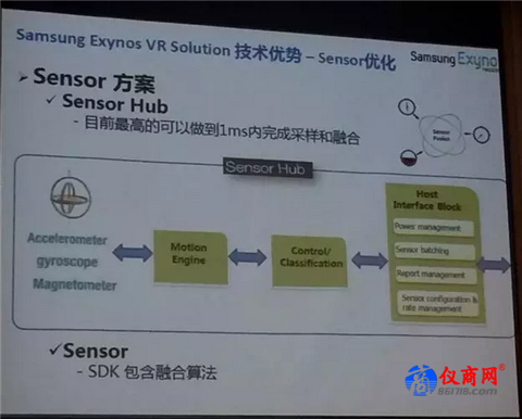 Sensor交互技術(shù)也是非常關(guān)鍵的。常規(guī)的加速器、陀螺儀、磁感應(yīng)器一個(gè)個(gè)加,加了之后所有的數(shù)據(jù)再傳輸給應(yīng)用處理器進(jìn)行處理,但這樣處理產(chǎn)生的功耗比較大,也會(huì)導(dǎo)致一些誤操作,不是很有效。