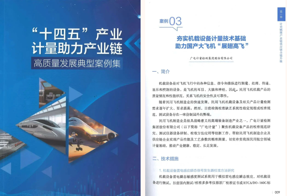 近日,由工業(yè)和信息化部科技司組織征集的《“十四五”產(chǎn)業(yè)計量助力產(chǎn)業(yè)鏈高質(zhì)量發(fā)展典型案例集》發(fā)布,廣電計量案例《夯實機載設(shè)備計量技術(shù)基礎(chǔ) 助力國產(chǎn)大飛機“展翅高飛”》成功入選,彰顯公司在航空產(chǎn)業(yè)計量領(lǐng)域的標(biāo)準(zhǔn)引領(lǐng)以及創(chuàng)新賦能作用。