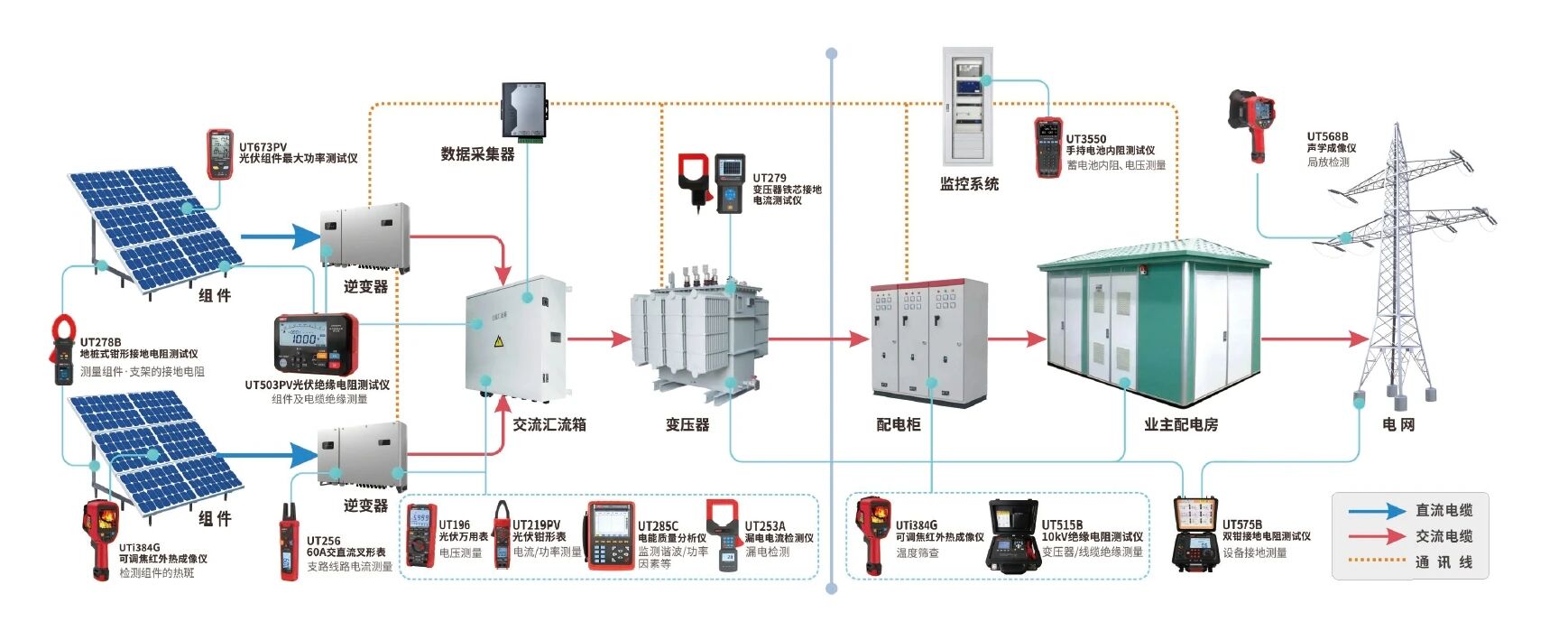 事實上,UTi640X只是優(yōu)利德賦能光伏運維的一環(huán)。圍繞電站全生命周期管理,優(yōu)利德已推出《光伏電站運行運維解決方案》,整合紅外熱成像儀、聲學成像儀、電能質量分析儀、絕緣電阻測試儀、交直流鉗形表等多維工具,真正實現從單一產品到全鏈路智能運維體系的跨越。