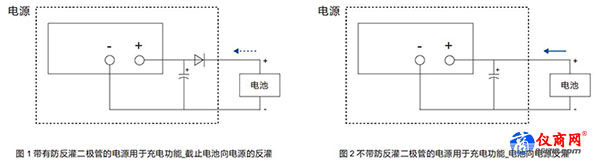 電源用于充電功能,在充電結(jié)束后,如圖 1,因?yàn)殡娫摧敵龆诉B接的二極管,可以阻止電池兩端的電壓反灌到電源的輸出電容;若無(wú)此二極管,如圖 2,充電結(jié)束后,電池兩端的電壓會(huì)反灌到電源的輸出電容,同時(shí)電源內(nèi)部的其他電路也可能在一定條件下消耗電池的能量。