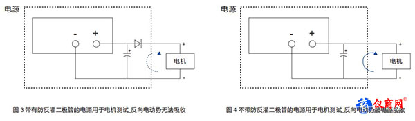 電源防反灌保護(hù)是這些硬件保護(hù)項(xiàng)目中比較特殊的一項(xiàng),因?yàn)檫@種保護(hù)是把雙刃劍,如果沒(méi)有選擇正確可能會(huì)對(duì)待測(cè)設(shè)備造成損害。有些電源在輸出端裝有防反灌二極管,以截?cái)嗄撤N測(cè)試情境下待測(cè)物的電流往電源方向倒送,阻止其對(duì)電源的硬件電路造成損壞,應(yīng)用說(shuō)明參見(jiàn)圖 1 & 2。然而對(duì)于另外一些測(cè)試領(lǐng)域,比如電動(dòng)設(shè)備測(cè)試領(lǐng)域,如果客戶在其電動(dòng)設(shè)備的設(shè)計(jì)電路上沒(méi)有考慮反向電動(dòng)勢(shì)的吸收,安裝防反灌二極管的電源也阻斷了反向電動(dòng)勢(shì)的吸收,這種反向電動(dòng)勢(shì)產(chǎn)生的高壓可能會(huì)擊穿待測(cè)設(shè)備,應(yīng)用說(shuō)明參見(jiàn)圖 3 & 4。