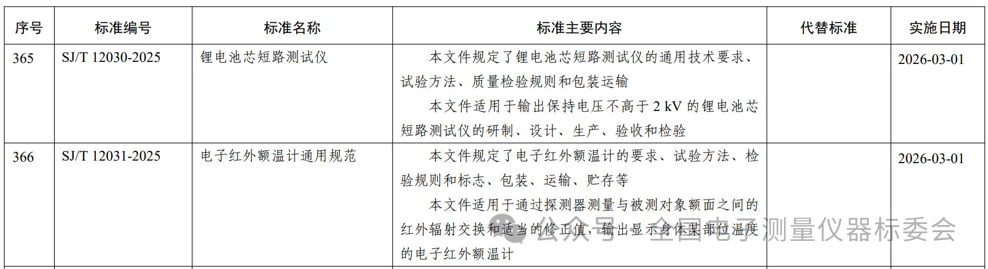 根據(jù)中華人民共和國工業(yè)和信息化部公告(2025年 第19號(hào)),由全國電子測(cè)量?jī)x器標(biāo)準(zhǔn)化技術(shù)委員會(huì)歸口的《鋰電池芯短路測(cè)試儀》(標(biāo)準(zhǔn)號(hào):SJ/T 10230-2025)《電子紅外額溫計(jì)通用規(guī)范》(標(biāo)準(zhǔn)號(hào):SJ/T 10231-2025)等2項(xiàng)電子行業(yè)標(biāo)準(zhǔn)正式發(fā)布。