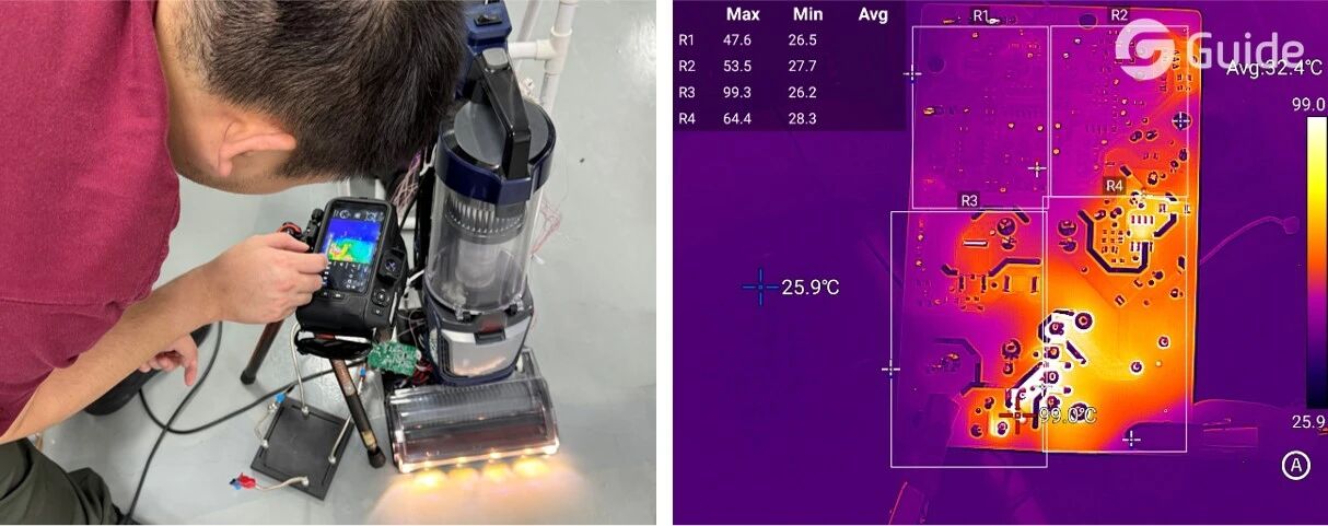 某知名智能家電企業(yè),是一家擁有百年歷史的家居清潔品牌。在其新一代洗地機的研發(fā)過程中,團隊需要精準評估主控板(PCBA)在不同清洗模式下的發(fā)熱和散熱表現(xiàn),從而為產品設計定型、運行穩(wěn)定性提升及能耗優(yōu)化提供可靠的數(shù)據(jù)支撐。該企業(yè)對多家廠商的熱像儀進行對比測試后,最終選擇高德智感PT系列紅外熱像儀,并搭配專用微距鏡頭,將其應用于洗地機新品的研發(fā)與品控環(huán)節(jié)。
