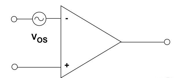理想狀態(tài)下,如果運算放大器的兩個輸入端電壓完全相同,輸出應(yīng)為0 V。實際上,還必須在輸入端施加小差分電壓,強制輸出達到0。該電壓稱為輸入失調(diào)電壓VOS。輸入失調(diào)電壓可以看成是電壓源VOS,如圖1-1所示。