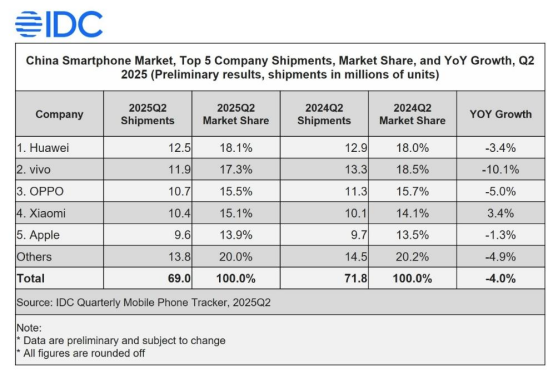 IDC 數(shù)據(jù)顯示,2025年二季度國內(nèi)手機(jī)市場,華為的份額已占 18.1%,出貨量達(dá)到 1220 萬臺(tái),同期的蘋果只有 13.9%,排在華為、vivo、OPPO 和小米之后。