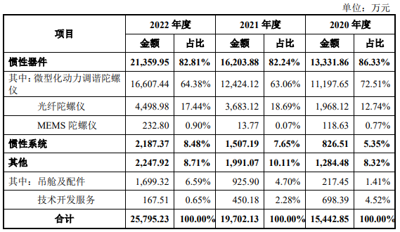 天箭慣性的核心產(chǎn)品為微型化動(dòng)力調(diào)諧陀螺儀,2020年-2022年,該產(chǎn)品實(shí)現(xiàn)的收入分別為1.12億元、1.24億元、1.66億元,占主營業(yè)務(wù)收入的比重分別為72.51%、63.06%、64.38%。為了解決產(chǎn)品結(jié)構(gòu)較為單一的問題,天箭慣性持續(xù)拓展產(chǎn)品線,如今光纖陀螺儀、MEMS陀螺儀新產(chǎn)品線已貢獻(xiàn)快兩成的收入。