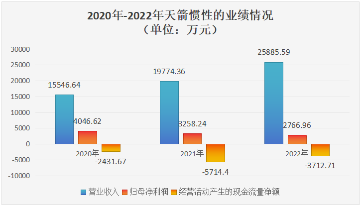 靠著陀螺儀產(chǎn)品,天箭慣性近三年?duì)I收穩(wěn)步增長,從2020年1.55億元增長至2.59億元,三年累計(jì)入賬6.12億元。但直到2018年天箭慣性才開始實(shí)現(xiàn)盈利,許氏父子整整花了22年。近三年天箭慣性雖然是盈利的,但其歸母凈利潤呈現(xiàn)逐年下降的趨勢,從2020年的4046.62萬元降至2022年的2766.96萬元。