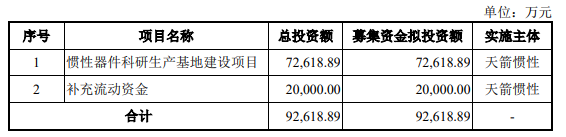 天箭慣性本次擬發(fā)行不超過1483萬股人民幣普通股(A股)股票,募集約9.26億元資金,投資于以下兩大項(xiàng)目: