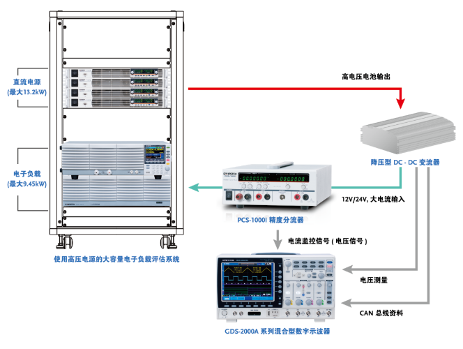 系統(tǒng)提供PSU系列可編程開關(guān)直流電源用于模擬車用電池的200V~400V電壓的輸出,電子負載PEL系列則可以模擬12V/24V的汽車電氣設(shè)備來做連續(xù)性的試驗。搭配PCS-1000I高精度的分流器組合,可以實現(xiàn)最大1000V電壓,最大300A電流的系統(tǒng)精準(zhǔn)量測。