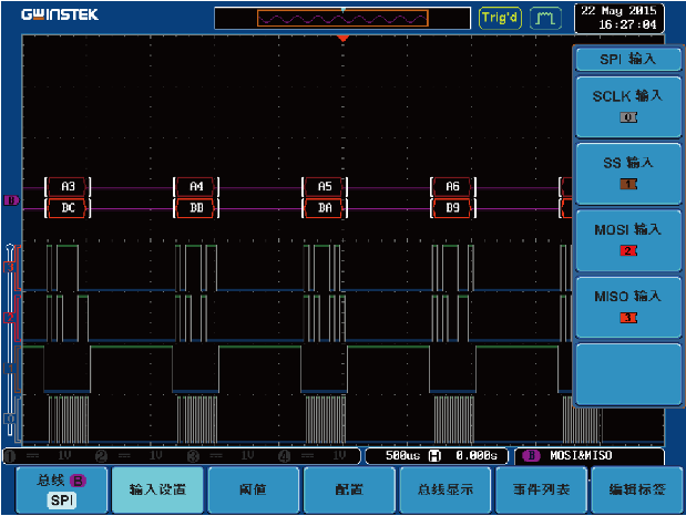 GDS-2000A數(shù)字示波器提供8CH/16CH的邏輯分析儀,可以直接做CAN模擬信號的總線解碼分析。依據(jù)這些可以觀測系統(tǒng)測試怠速停止時的起動條件所發(fā)出的ID,取得特定電壓值及電流值數(shù)據(jù)資料以及相關(guān)信號。