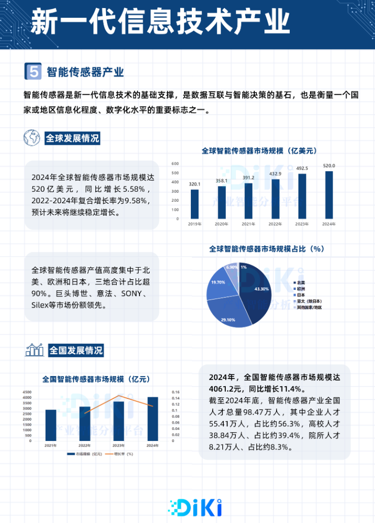 近期,深圳國家高技術(shù)產(chǎn)業(yè)創(chuàng)新中心發(fā)布《數(shù)說“十五五”新興和未來產(chǎn)業(yè)布局》系列內(nèi)容,披露了部分新一代信息技術(shù)產(chǎn)業(yè)發(fā)展信息,其中,包括智能傳感器產(chǎn)業(yè)。本文僅簡略披露部分相關(guān)智能傳感器產(chǎn)業(yè)信息,詳細(xì)數(shù)據(jù)請查看深圳國家高技術(shù)產(chǎn)業(yè)創(chuàng)新中心相關(guān)內(nèi)容。報告顯示,2024年全球智能傳感器市場規(guī)模達(dá)520億美元,同比增長5.58%,2022-2024年復(fù)合增長率為9.58%,預(yù)計(jì)未來將繼續(xù)穩(wěn)定增長。