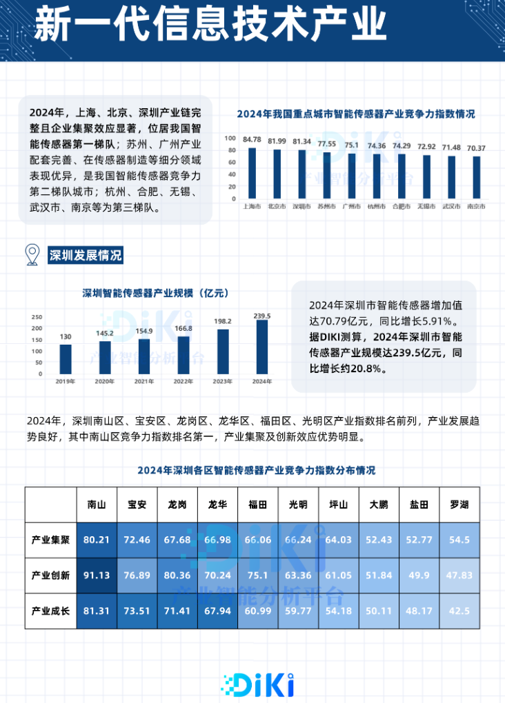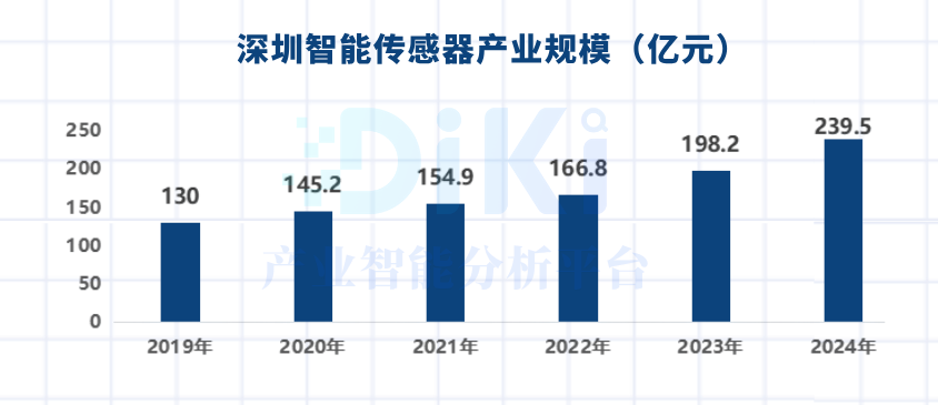 2024年深圳市智能傳感器增加值達(dá)70.79億元,同比增長5.91%。據(jù)DIKI測算,2024年深圳市智能傳感器產(chǎn)業(yè)規(guī)模達(dá)239.5億元,同比增長約20.8%。
