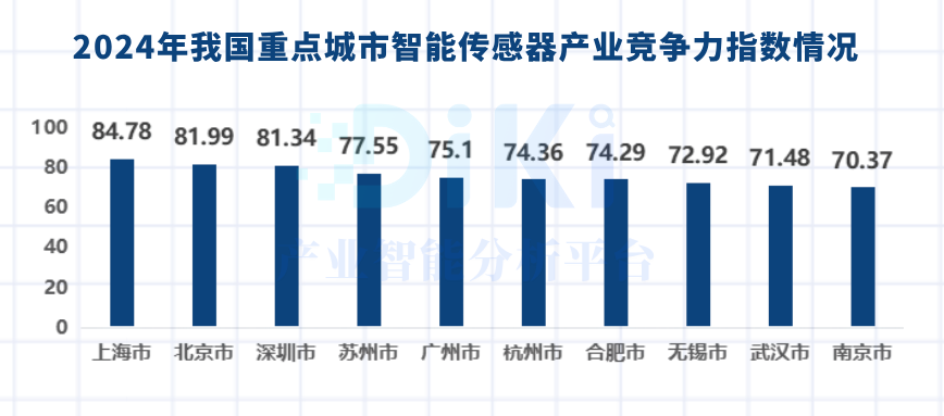 2024年,上海、北京、深圳產(chǎn)業(yè)鏈完整且企業(yè)集聚效應(yīng)顯著,位居我國智能傳感器第一梯隊(duì);蘇州、廣州產(chǎn)業(yè)配套完善、在傳感器制造等細(xì)分領(lǐng)域表現(xiàn)優(yōu)異,是我國智能傳感器競爭力第二梯隊(duì)城市;杭州、合肥、無錫、武漢市、南京等為第三梯隊(duì)。