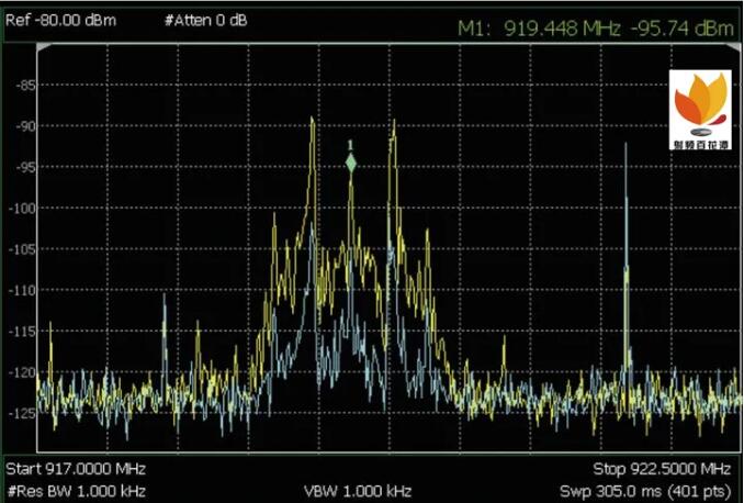 圖2. 在標(biāo)準(zhǔn)的 Clear/Write ( 藍(lán)色跡線 ) 和 MaxHold (黃色跡線 ) 模式中顯示的跳頻信號(hào)的測(cè)量結(jié) 果??梢钥吹?,左側(cè)信號(hào)是靜止的。