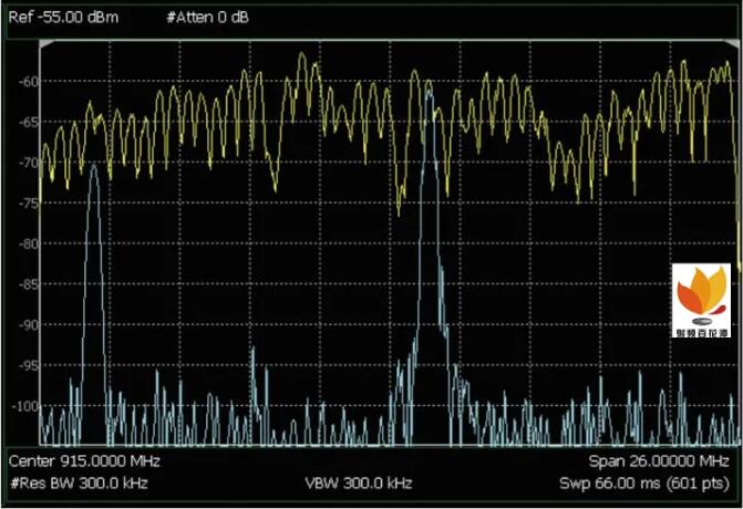 MaxHold 顯示模式可存儲(chǔ)和顯示多次 掃描中的最大跡線值。此模式位于 FieldFox 的“TRACE ( 跡線 )“菜單下。圖 2 顯示了使用分析儀 ( 配備兩條活 動(dòng)跡線 ) 對(duì)跳頻載波進(jìn)行測(cè)量的結(jié)果。跡線 1 ( 黃色 ) 配有 MaxHold 模式,跡 線 2 ( 藍(lán)色 ) 是標(biāo)準(zhǔn)的掃描“清除/寫(xiě) 入”(Clr/Wr) 模式。經(jīng)過(guò)幾次掃描之 后,MaxHold 跡線相對(duì)穩(wěn)定,而 Clr/ Wr 跡線變化極大,這是因?yàn)樘l信 號(hào)會(huì)隨著時(shí)間不斷變化。在測(cè)量過(guò)程 中我們發(fā)現(xiàn),左側(cè)顯示的另一條跡線 沒(méi)有按照此 ISM 頻段在非許可工作模 式下通常的要求進(jìn)行跳頻。當(dāng)固定頻 率信號(hào)與跳頻信號(hào)在頻域中最終發(fā)生 碰撞時(shí),前者可能是后者的干擾源。MaxHold 顯示模式主要是在只需要間 歇信號(hào)最大幅度的時(shí)候使用。如果需 要觀察信號(hào)隨時(shí)間的變化,則可以使 用頻譜圖或串接顯示模式,對(duì)間歇信 號(hào)結(jié)構(gòu)進(jìn)行更深入的分析。