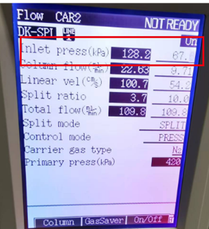 在分流模式下,大多數(shù)的樣品是經(jīng)過分流流路排出的,所以為了保護分流電磁閥不會被樣品堵塞,在分流氣路中電磁閥前串聯(lián)了過濾器對樣品進行吸附(通常情況下過濾器6個月需要更換,做高沸點及室溫下結(jié)晶樣品時建議3個月更換),因為分流流路是在儀器的頂部,溫度和室溫相近,液化或者凝固的樣品就會保留在分流氣路中。所以分流流路是最容易堵塞的,當管路堵塞到一定程度,電磁閥的開合大小就起不到調(diào)節(jié)進樣口壓力的作用了,會出現(xiàn)如下的故障現(xiàn)象,如圖二。