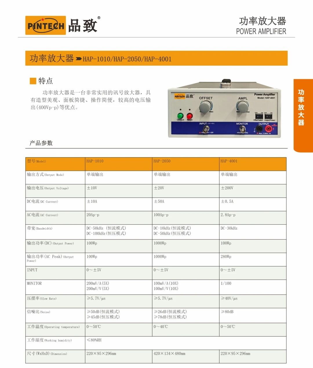 在選擇功率放大器時(shí),查閱規(guī)格參數(shù)常會(huì)發(fā)現(xiàn)一個(gè)看似矛盾的現(xiàn)象:例如品致 HAP-4001 放大器,其直流電流額定值僅為 0.5 A,而交流電流卻可達(dá) 2.8 A(峰峰值)。這種差異并非設(shè)計(jì)矛盾,而是反映出放大器的核心限制——熱耗散能力才是真正的瓶頸,而非單純的電流輸出能力。