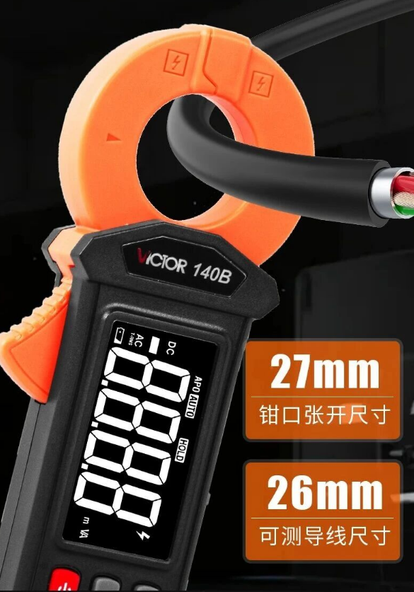 該鉗形漏電流表在設(shè)計上獨具匠心。27毫米的鉗口尺寸,直徑27mm,最大可測電流導(dǎo)線26mm,能夠輕松應(yīng)對不同規(guī)格的導(dǎo)線測量。高清大屏顯示,采用VA反顯屏幕,最大5999(3 5/6)顯示,帶單位,字跡清晰易讀,即使在光線復(fù)雜的環(huán)境下也能準(zhǔn)確讀取數(shù)據(jù)。VICTOR 140B還配備了Type - c充電接口,內(nèi)置3.7V鋰電池,不僅充電方便快捷,還可選配DC5V/1A - 5A適配器進(jìn)行充電,無操作約15分鐘自動關(guān)機(jī),有效節(jié)省電量。表筆插孔設(shè)計合理,儀器底部有輸入插孔,緊固良好,上面有最大輸入提示,安全可靠。