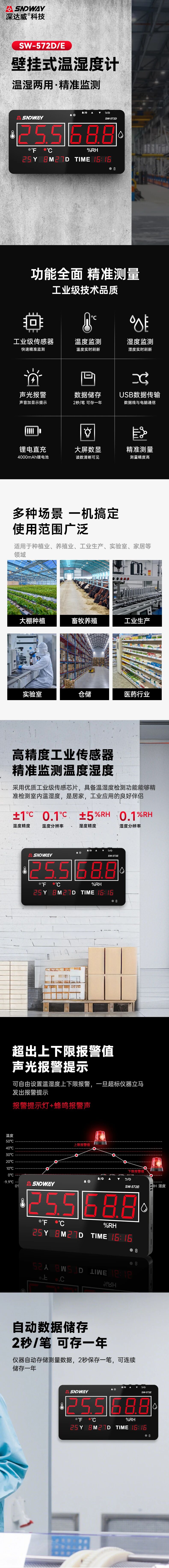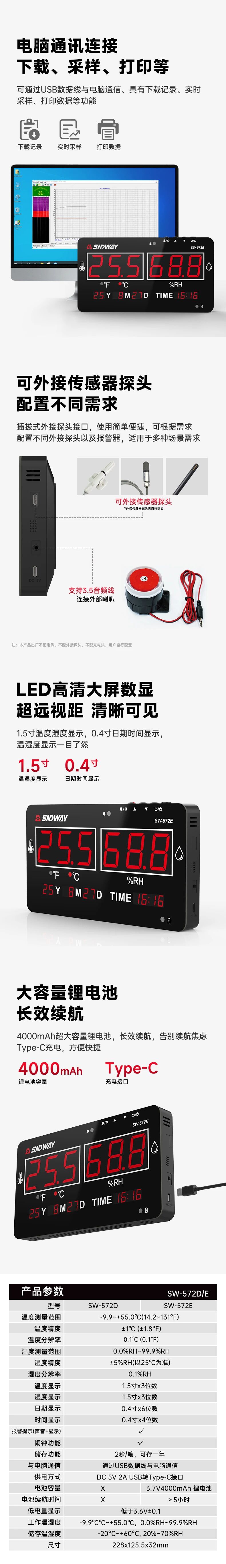 在功能方面,SW-572E支持用戶自定義溫濕度報(bào)警上下限,超出設(shè)定范圍時(shí)可觸發(fā)聲光報(bào)警。設(shè)備具備自動數(shù)據(jù)存儲能力,每2秒記錄一次數(shù)據(jù),最多可連續(xù)存儲一年。通過USB Type-C接口,用戶可連接電腦進(jìn)行數(shù)據(jù)下載、實(shí)時(shí)采樣或打印,也可外接傳感器探頭及報(bào)警器,擴(kuò)展監(jiān)測場景。