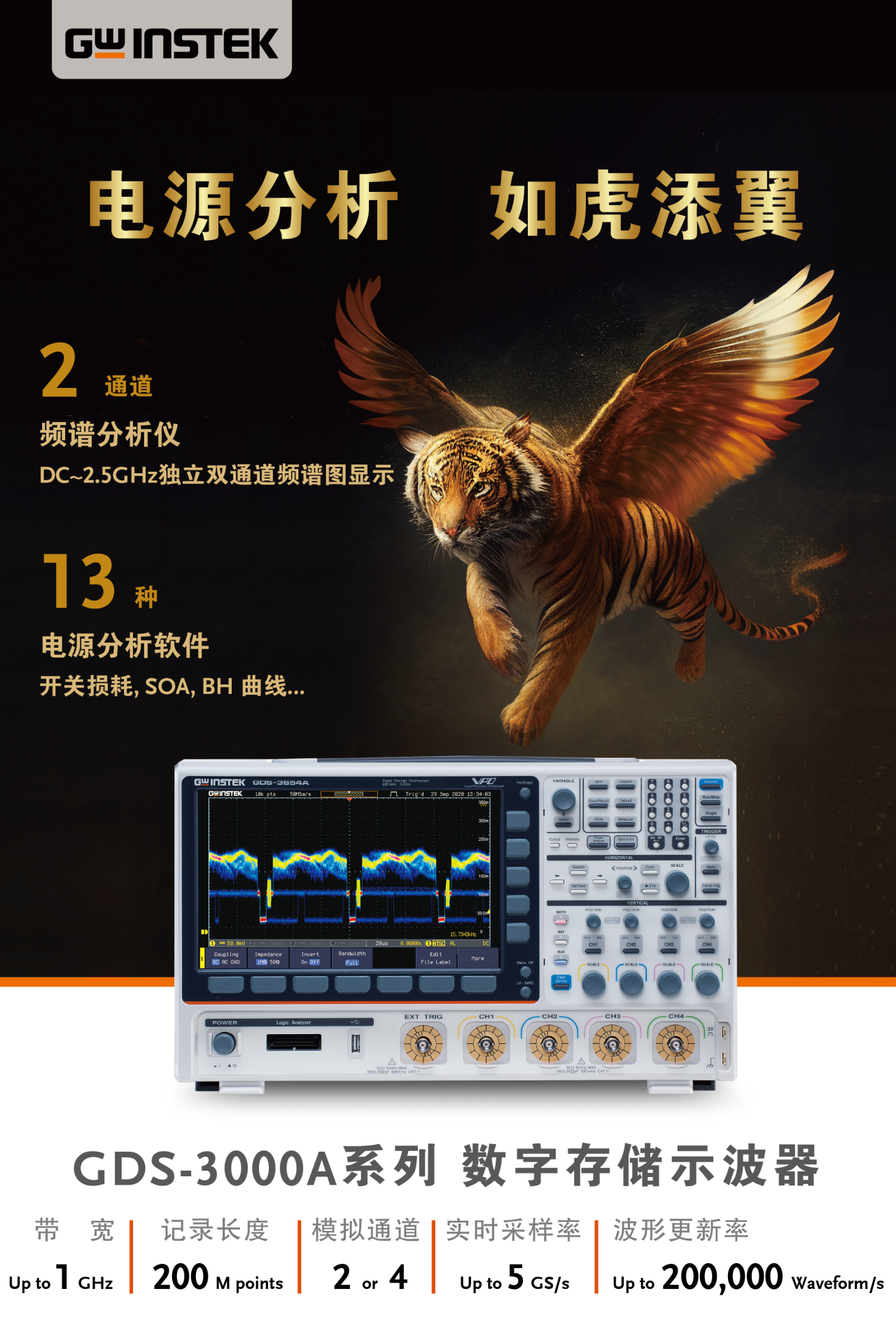 在波形顯示技術方面,GDS-3000A系列示波器能夠顯示RGB顏色梯度,每個梯度8位,能夠描繪出深刻的梯度波動;重新創(chuàng)建模擬示波器的顯示功能。當輸入復合信號時,GDS-3000A系列能夠精確顯示彩色猝發(fā)信號,并以亮度顯示多層次的細節(jié),用戶可以輕松地確定和分析波形。