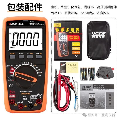 每臺(tái)VC9825標(biāo)準(zhǔn)配置包括:主機(jī)、彩盒包裝、儀表包、說明書、合格證、原裝表筆、AAA電池×4、溫度探頭及高壓測(cè)試附件。